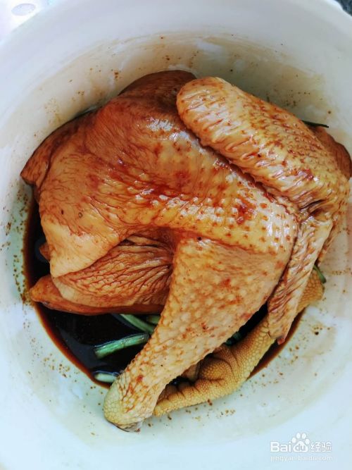 用牙签在鸡皮上扎一些小孔,把鸡放入碗中,加入盐、料酒、生抽、老抽、胡椒粉、淀粉、十三香、小葱,拌匀按摩片刻后密封放入冰箱冷藏腌制一晚