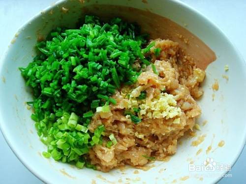 毛芹菜丁加到肉馅里拌均匀,加鸡精拌均匀,加盐拌均匀,加香葱末,加姜