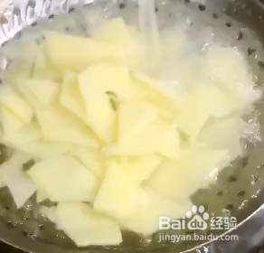 土豆切片,大叶芹洗净,锅中烧水,放土豆片,大叶芹焯水捞出