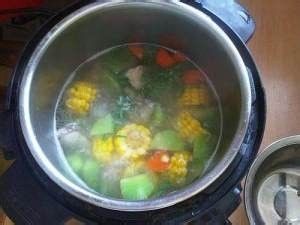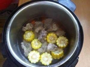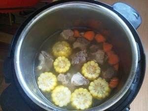 电压力锅里加入适当开水,并下入玉米、胡萝卜、排骨和几滴醋,盖上电压力锅的盖子,将电压力锅调至煲汤档。