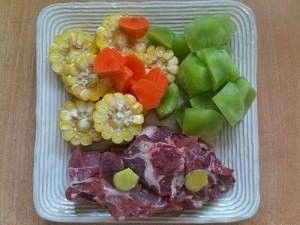 玉米切段,莴笋切滚刀块,胡萝卜切滚刀块,排骨洗净沥干水,姜切片