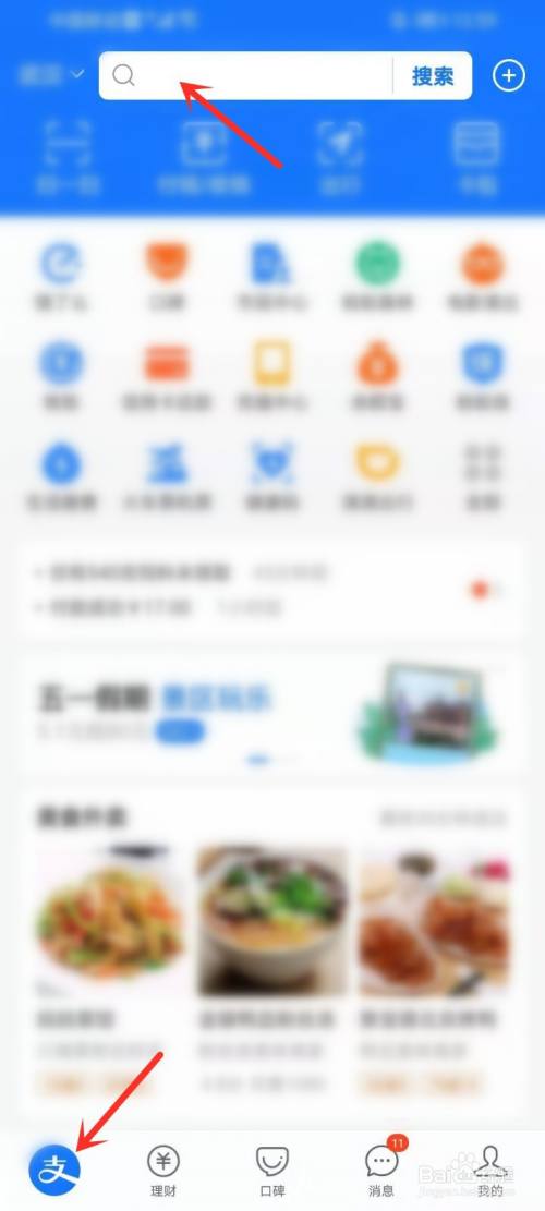 打开支付宝APP首页,点击顶部的搜索框,进入搜索界面。