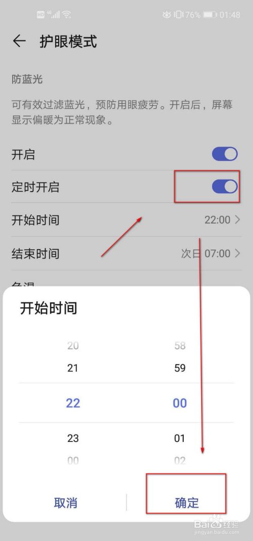 开启护眼模式后,也可自定义护眼模式开始和结束的时间。单击开始或结束的时间按钮,选好时间点后再单击【确定】即可。