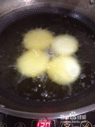 12.温油放入糖面坯,慢慢炸,炸至两面金黄色捞出