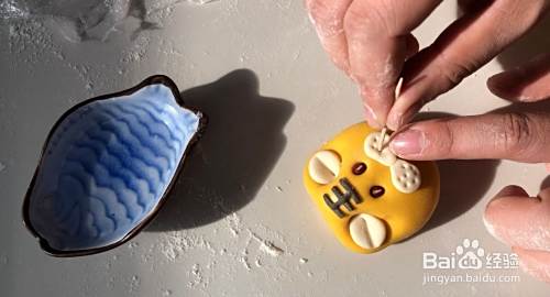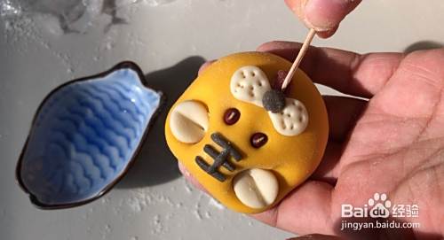 粘上耳朵和头顶王字。红豆提前泡泡做眼睛,然后粘上小圆胡子,用牙签扎几下。