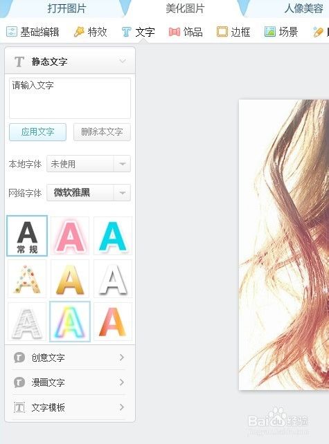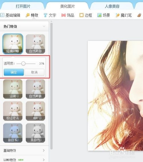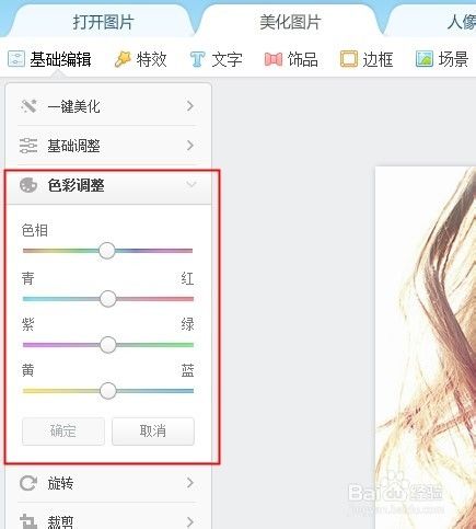 基础调整里可以进行图片的单项的修改。如拍的图亮度不够,不够清楚等。都可以在这里通过尝试适量调整相应项来达到修正一下,记得改后要确定哦