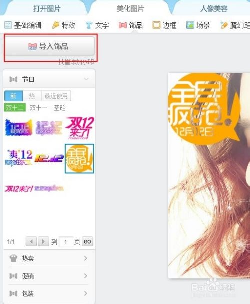 在饰品里同样的有很多的现成的饰品供我们添加到自己的图片上,并且可以导入自己的饰品。饰品添加到图片上以后可以光标拖动饰品的位置,还可以改变饰品的大小。而水印也可以通过点击导入饰品来添加。