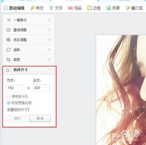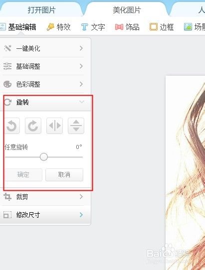 打开要编辑的图片后,进入的是图片修改的基础编辑项。在这里面可以对图的色彩,角度和尺寸的修改。