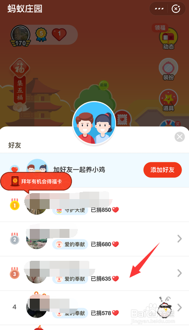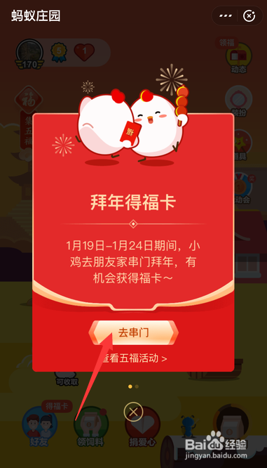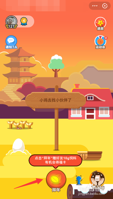 点击箭头所指的拜年按钮,给好友的小鸡投放10g饲料