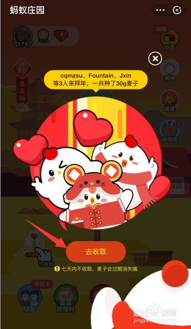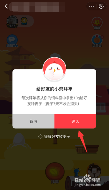 这时,会弹出一个提醒窗口,告知“每次拜年将从你的饲料袋中拿出10g给好友种麦子(麦子7天不收会消失)”,点击确认