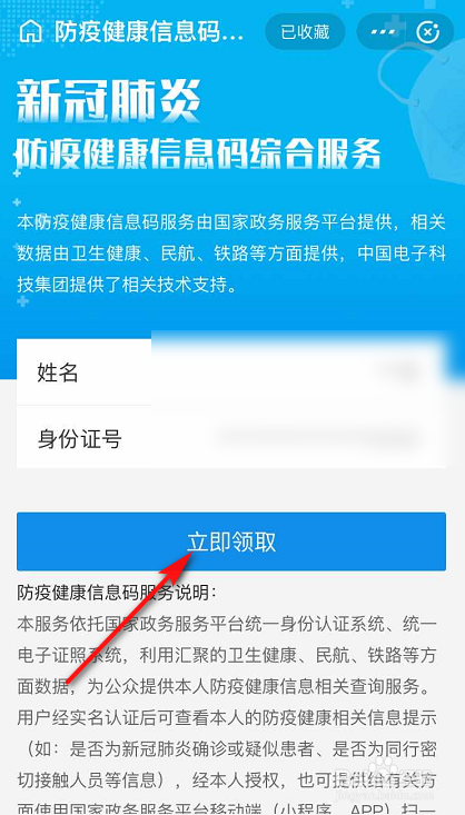 4、跳转到国家政务服务平台界面,点击-立即领取