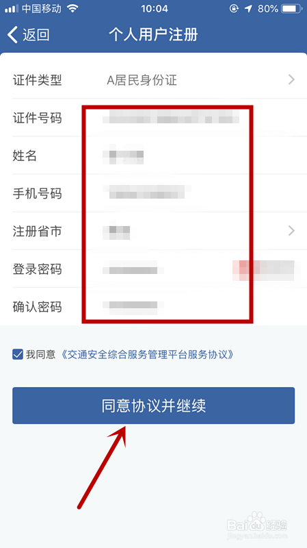 在注册页面输入证件号码、姓名、手机号码等相关信息,如图