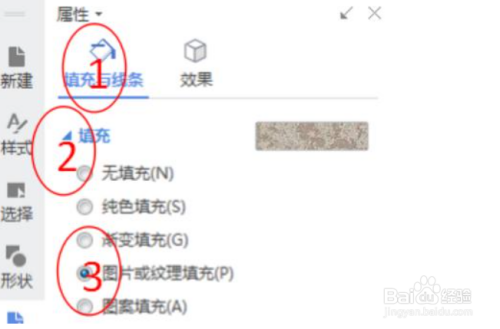 修改图形属性。在右边的属性框内,单击“选择与填充”,单击“填充”选项。