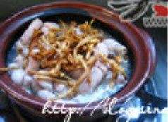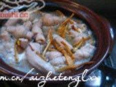接着取一口砂锅,把洗好的金针菜放到砂锅里,加入压好的小肠,再加点汤,开火煮10分钟,这道煲就完成咯