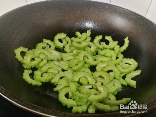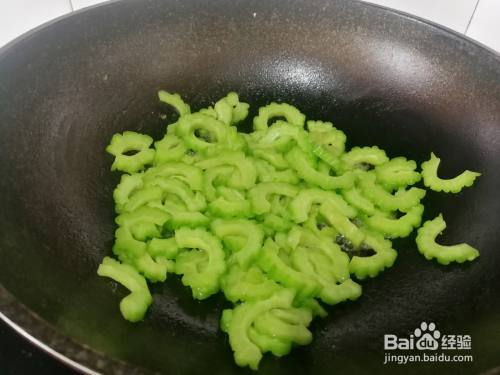 锅中重新倒入食用油,烧至八分开,放入苦瓜大火煸炒至翠绿色。