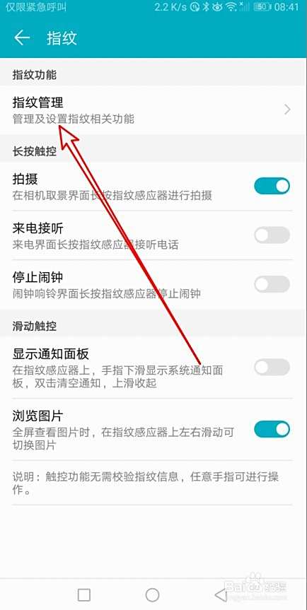 这时就会进入指纹页面,点击指纹管理的菜单。