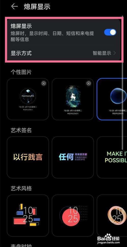 3、打开熄屏显示开关,还可以自定义选择显示样式和显示方式。