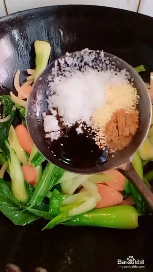 锅中烧油,然后将切好的洋葱、火腿片、小白菜倒进去翻炒至断生,再放入食盐、蚝油、鸡粉等调味翻炒均匀。