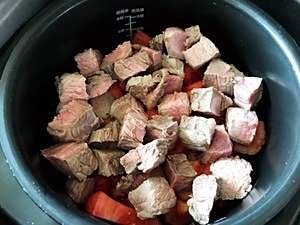 加适量盐,加入去皮切块的土豆和胡萝卜搅拌均匀再炖25分钟