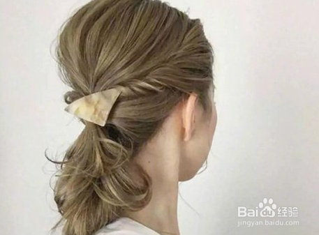 绑好条低马尾,把耳下的发丝拉下来,加自然感,头顶的头发拉松。马尾中拿出一小束头发并围住橡皮圈,发夹夹好,抓松即可。