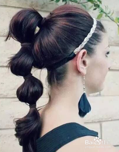 绑好条高马尾,然后留出一段马尾,抓松,绑一个发圈,绑出一个灯笼状,按照此方法,绑第二个或者第三个,根据头发长短来定。