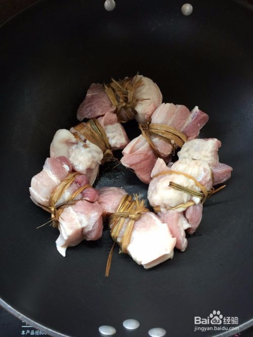 将五花肉切成大块,再用稻草将五花肉捆好;