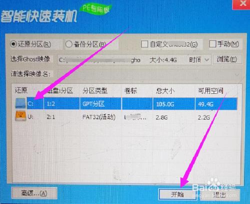 在“智能快速装机”软件主面板中,选中【分区C】,单击【开始】,系统安装完成之后即可重新开机。