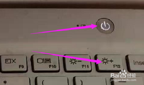 在电脑的键盘上,按一下【开机按钮】开机,接着不断按放【F12】键。