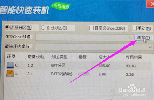 在“智能快速装机”软件主面板的“还原分区”板块中,单击【浏览】进入。