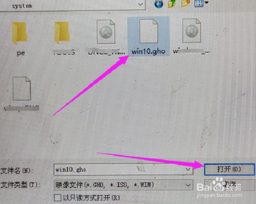 在“打开”弹框中,选中【win10.gho】文件,单击【打开】进入。