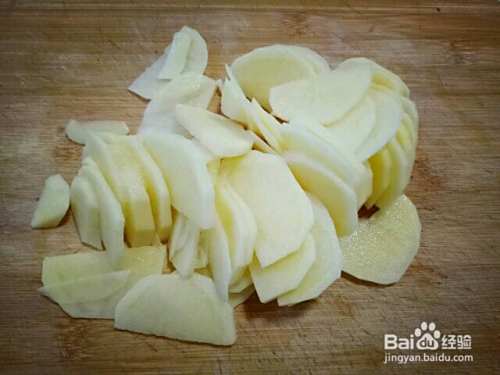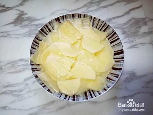 切好的土豆片放入盘子里,冷水冲洗两遍,洗掉淀粉,再用清水泡5分钟