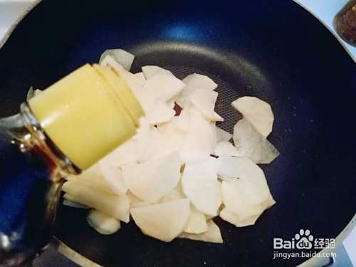 热锅冷油,加入切好的土豆片煸炒,再加入生抽,小火煸炒均匀