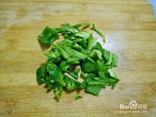 把青椒洗干净,去根,去籽。再切块,不要切太大。
