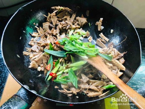 加入青蒜,小米椒爆炒,我喜欢老点,所以提前放青蒜,也可以后面加的