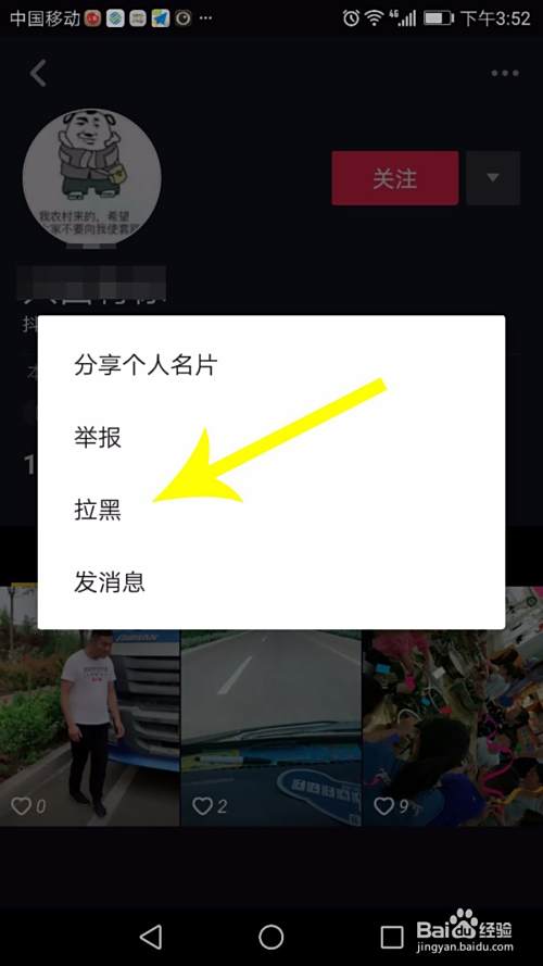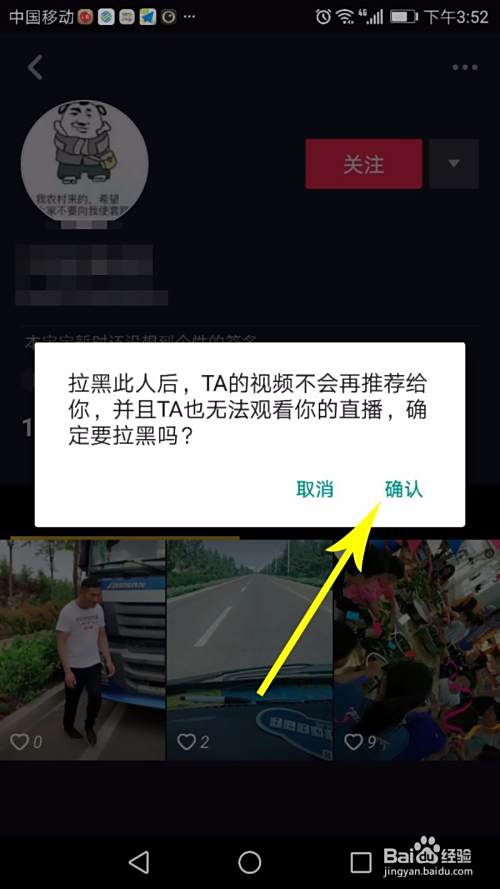 如果问题无法解决,那么我们可以做的就是拉黑对方,将此粉丝拉入自己的黑名单中,这次是点击“发消息”上面的“拉黑”选项,接着在新打开的对话框中点选确认即可将此粉丝拉黑,拉黑后,她的视频首先不会再推荐给你,他也不能在看你的直播