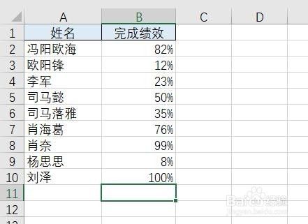 在Excel中输入需要整理的一些员工的姓名和员工所对应的绩效程度。