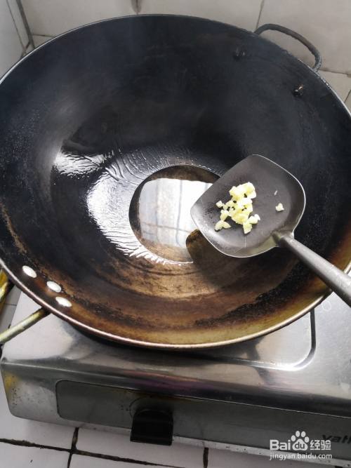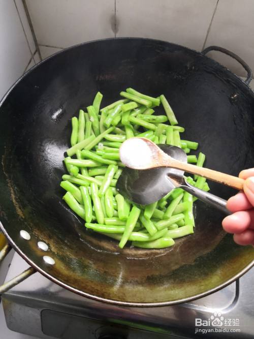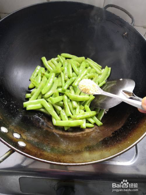 3、锅中放油,加入大蒜爆香后放入四季豆,炒至八成熟;
