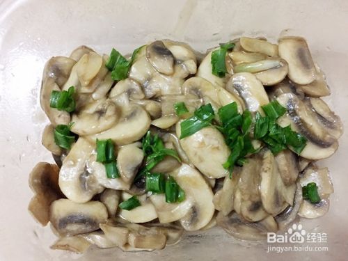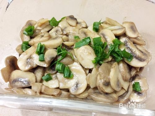 准备好食材:口蘑清洗干净并切片,大蒜2粒切片、葱切葱花备用。