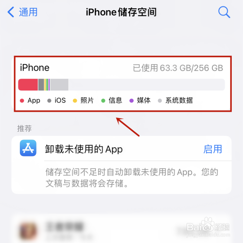 在iphone储存空间页面中即可查看内存容量,以及【App】、【ios】、【照片】、【信息】、【媒体】、【系统数据】的容量占比。