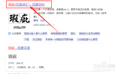接着在搜索结果列表中找到“瑕疵”的百度百科链接,点击打开。