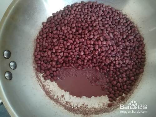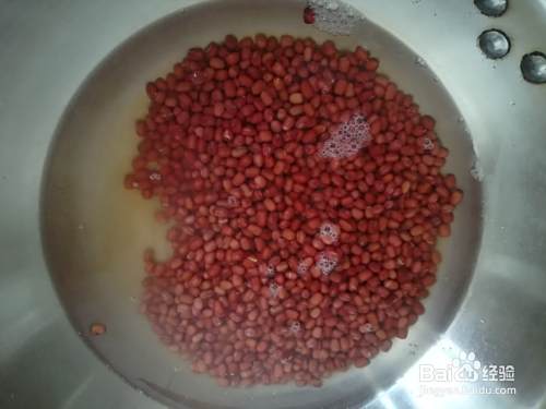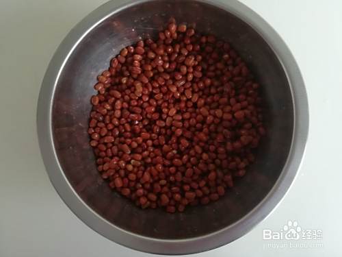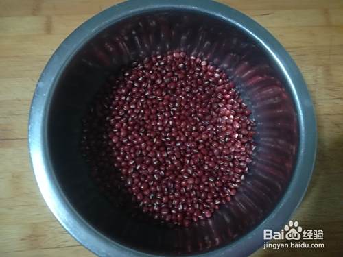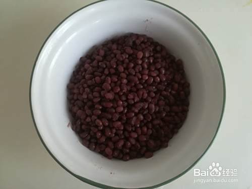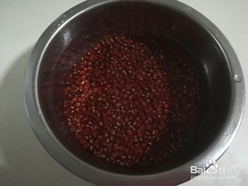 等红小豆泡涨了,把多余的水倒出去,留红小豆。