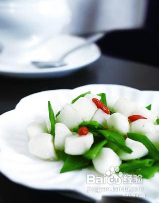 材料:西芹、鲜百合、红彩椒、虾仁、鸡蛋清1/2,姜片、盐、鸡精、水淀粉、少许白糖