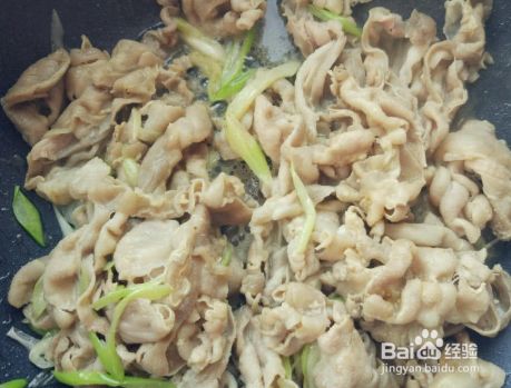 大火快速将其滑炒均匀,炒至羊肉卷变色的时候,将葱段放入,混合炒均匀后,淋入调好的料汁,翻炒均匀;