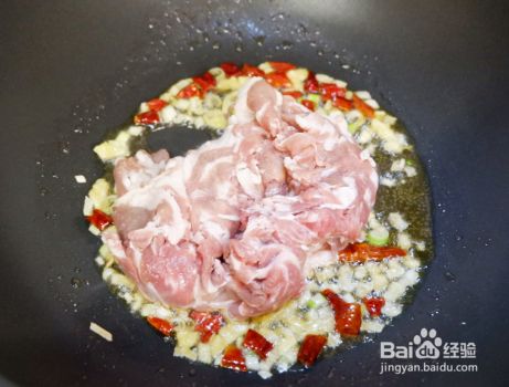 加上5克的清水化开,炒锅中添上比平常炒菜稍微多一点的食用油,烧热后放入姜丝和干红辣椒,小火煸香,放入腌制好的羊肉卷;