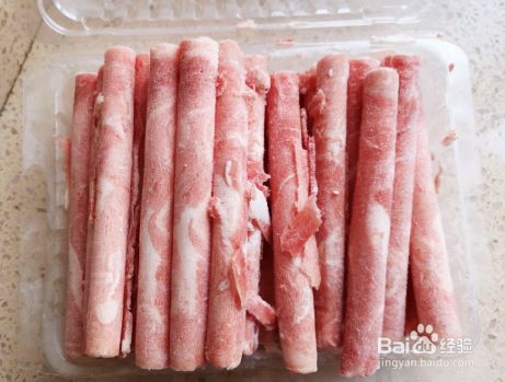 羊肉卷从冰箱取出来,放入一个大碗中,加上点食盐、料酒和少许的玉米淀粉,磕入一个蛋清,将其用手抓均匀;