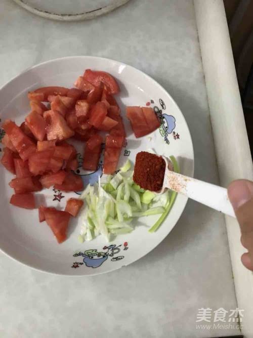 3西红柿切碎,葱切葱花,撒上一调料勺辣椒面,辣椒面可以根据个人口味增减