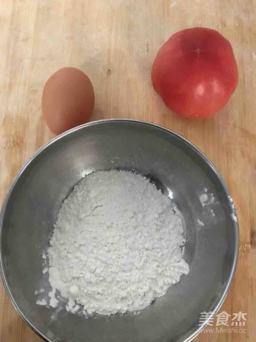 1面粉80g放入碗中,鸡蛋一个,西红柿一个洗净