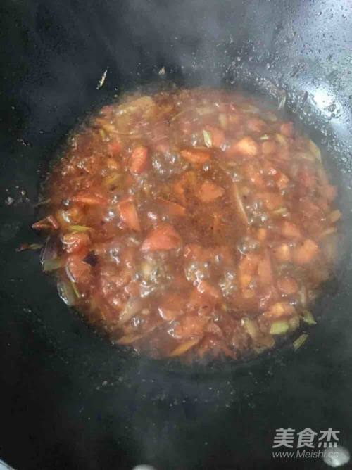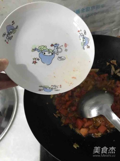5倒入西红柿翻炒一下再淋入少量水炒至西红柿成汁状,我用的是盛西红柿的碟,所以会有红色的东西