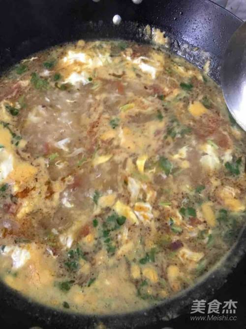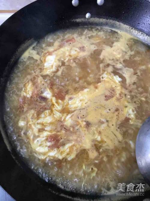 13往汤中淋入拌好的蛋液,边搅边煮1分钟