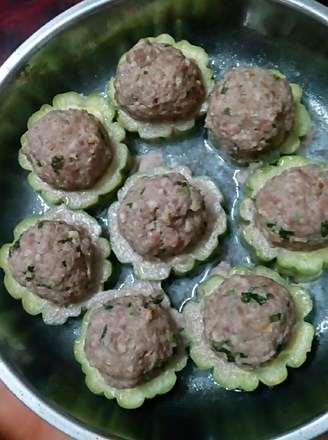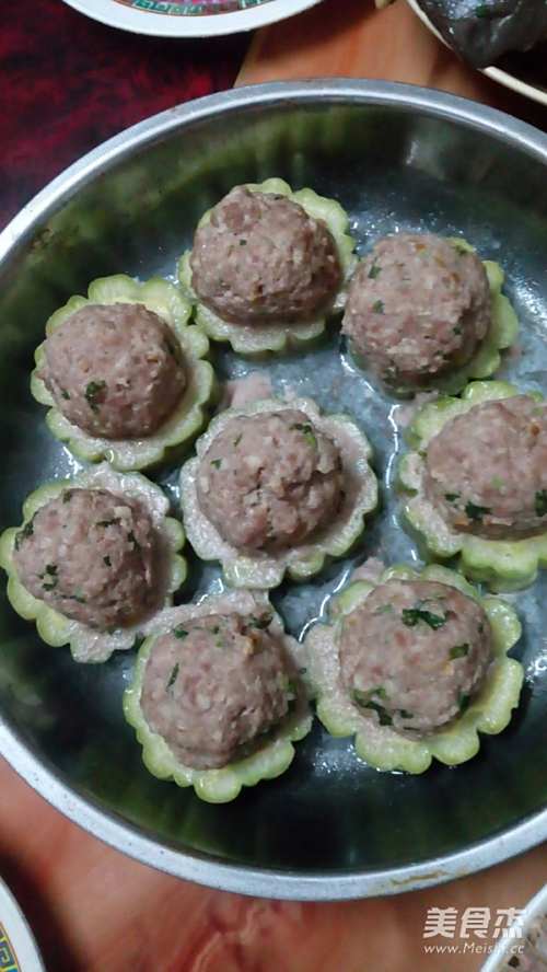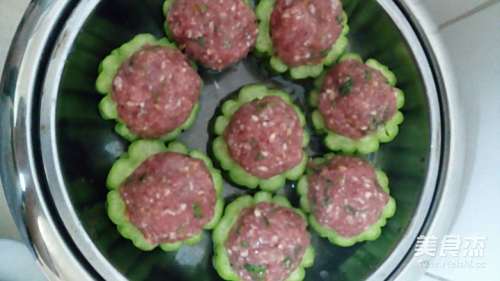 用手将打起胶的牛肉丸挤出一个个丸子放到苦瓜上面,入锅蒸20分钟即可
